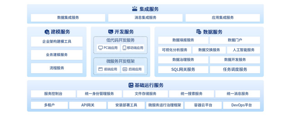 ASP+基礎(chǔ)運行服務(wù):提供了云原生、微服務(wù)、組件化、服務(wù)化等基礎(chǔ)運行環(huán)境和可復(fù)用的基礎(chǔ)技術(shù)組件、可共享的技術(shù)服務(wù),為用戶業(yè)務(wù)系統(tǒng)建設(shè),從平臺層面實現(xiàn)環(huán)境適配能力和全面安全保障能力。